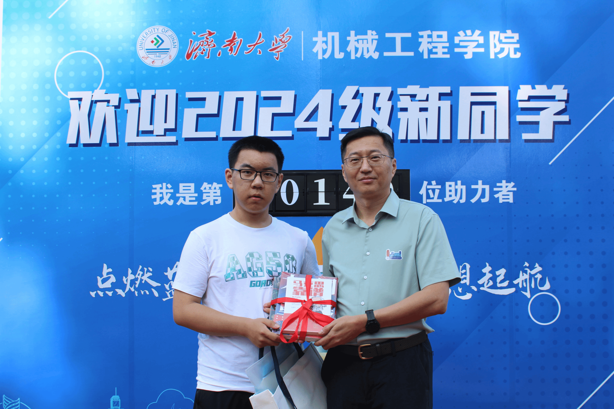 报到当天,恰逢两位新生同学生日,学院党委书记程涛为同学赠送书籍和新生入学礼包,勉励新生要珍惜大学生活,不忘初心,砥砺前行,并与新生亲切合影留念。现场同学们齐送祝福,表达了对两位同学的真诚祝愿。