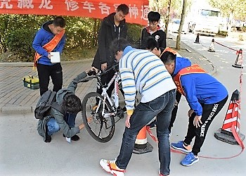 活动开始前,修车志愿者们已提前到场,检查工具,积极快速准备。没多久就有路过的同学前来寻求帮助,有借工具的,有车子出问题的。当同学推着自行车前来求助时,志愿者们非常热情,同时配合有序。有专门负责找工具、递送工具的,有负责拆卸的,也有帮忙辅助移动车身的。修车过程中,有的问题会让缺少经验的成员感到困惑,这时经验丰富的学长会为大家细心指导。只见学长熟练的拧下螺丝,调试刹车,队友们默契的递送工具,成员们借此了解知识,在互相交流实践中提高了自己。经过一番修理,车主试骑确认正常后对修车队的志愿者们表示感谢。志愿者们也为自己修车技术得到提升而感到高兴。