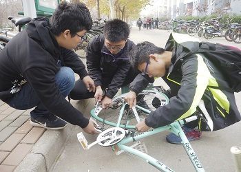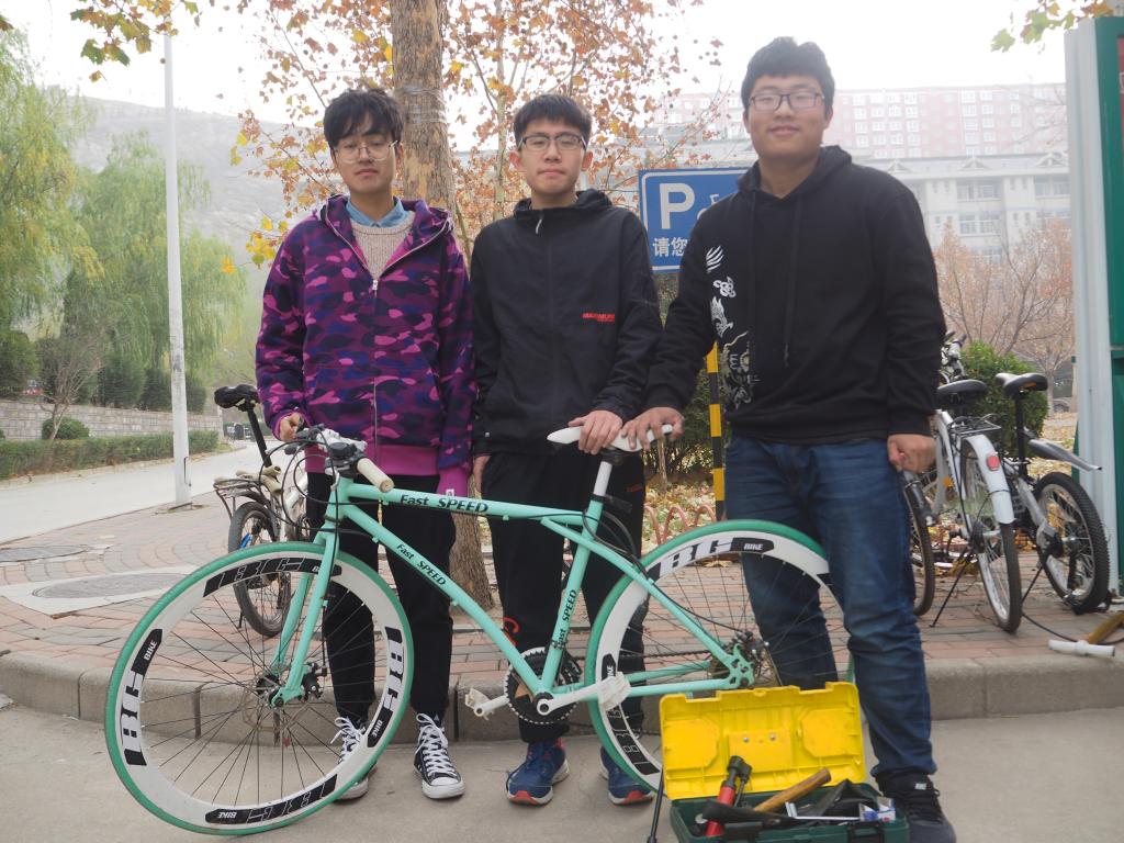 活动开展前,各志愿者已准备就绪,工具很快检查完毕。纵然寒风刺骨,仍挡不住修车队员的热情,没一会儿,很多慕名而来的同学都推着自己的爱车前来求助。补胎,刹车不灵待调等情况,这些问题都在志愿者们默契的配合下都得了解决。但在接近尾声的时候,遇到了一个棘手的问题,一位同学的车胎脱落,由于冬天气温较低,车胎变硬,复原变得十分困难。最终,志愿者们在互相讨论与配合中找到了解决方法,在修车过程之中,明显的看出各位志愿者在交流中相互进步,技术得到了很大提升。看着求助的人高兴的离开,志愿者们脸上也露出了满意的表情。